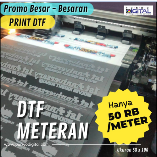 Kami melayani jasa cetak DTF, jasa print DTF, jasa sablon DTF meteran dengan mesin skala industri ukuran lebar 60cm hingga panjang 50 meter. Bebas request, bisa custom, full support, hasil sesuai ekspektasi. Harga terjangkau.